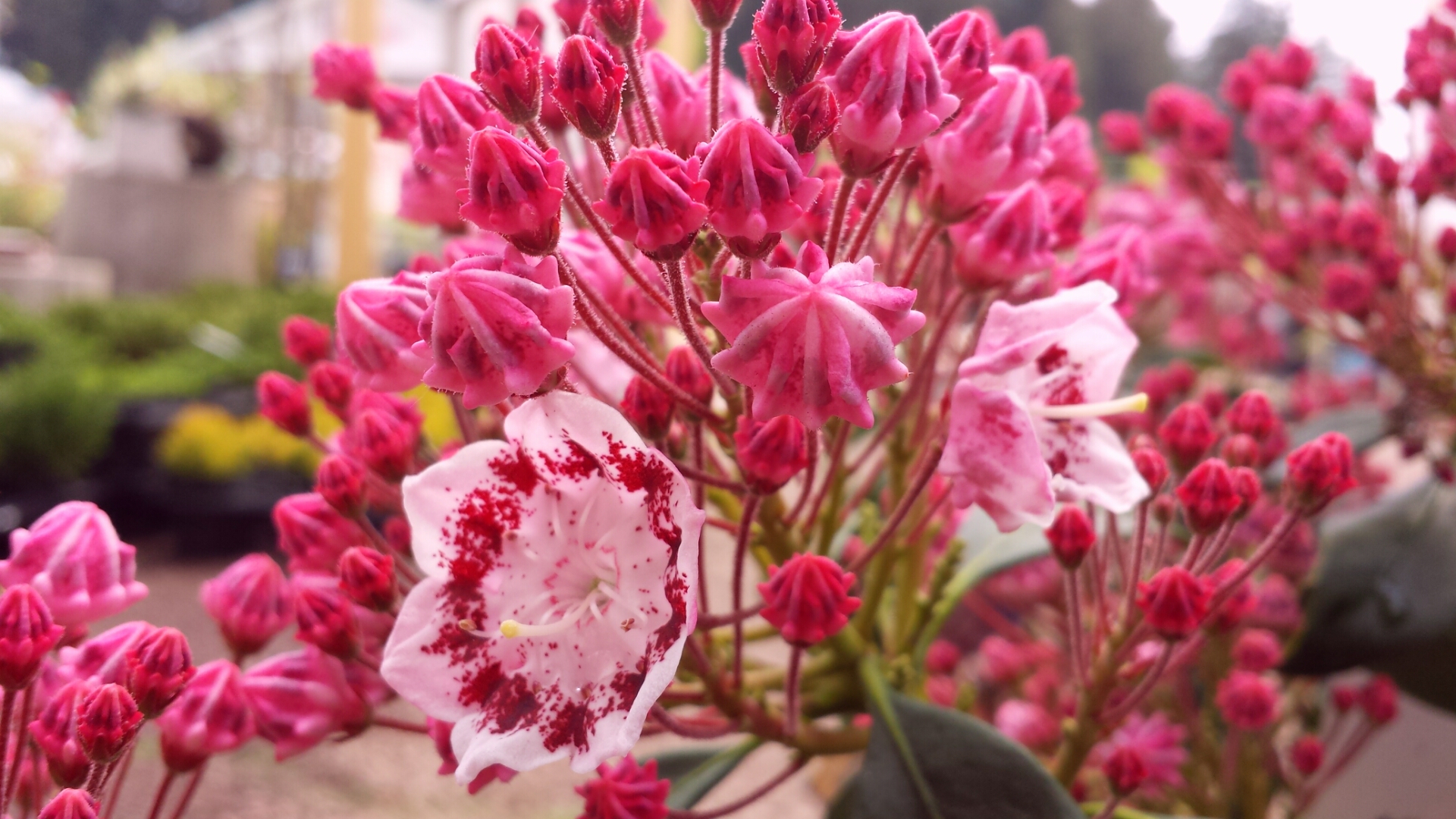 今年もアンシャンテ安曇野店の前に、チョコレートのアポロに良く似た「カルミヤ」が並んでいます。